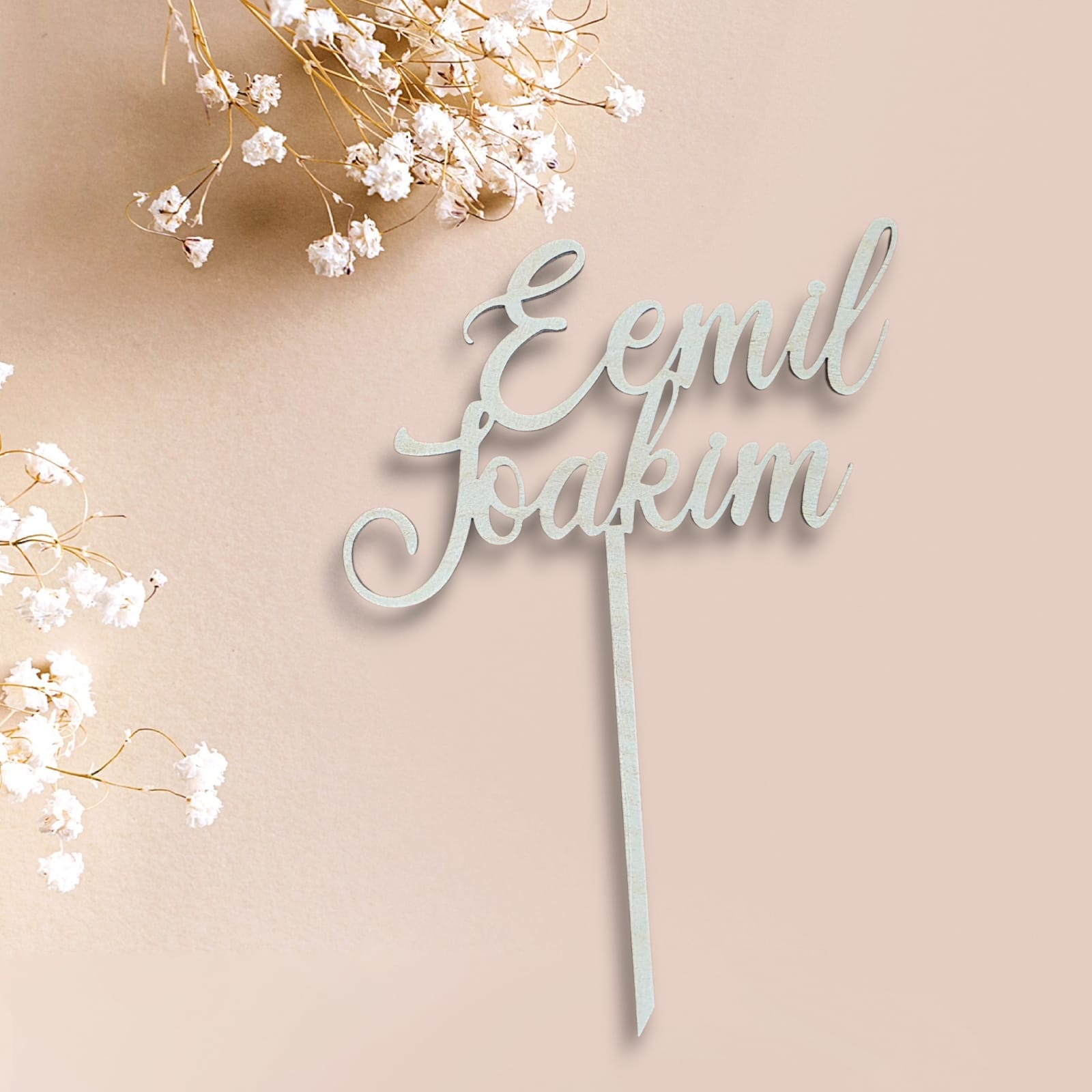 Kotimaisesta koivuvanerista valmistettu kaunis kakkukoriste valitsemillasi kahdella nimellä.