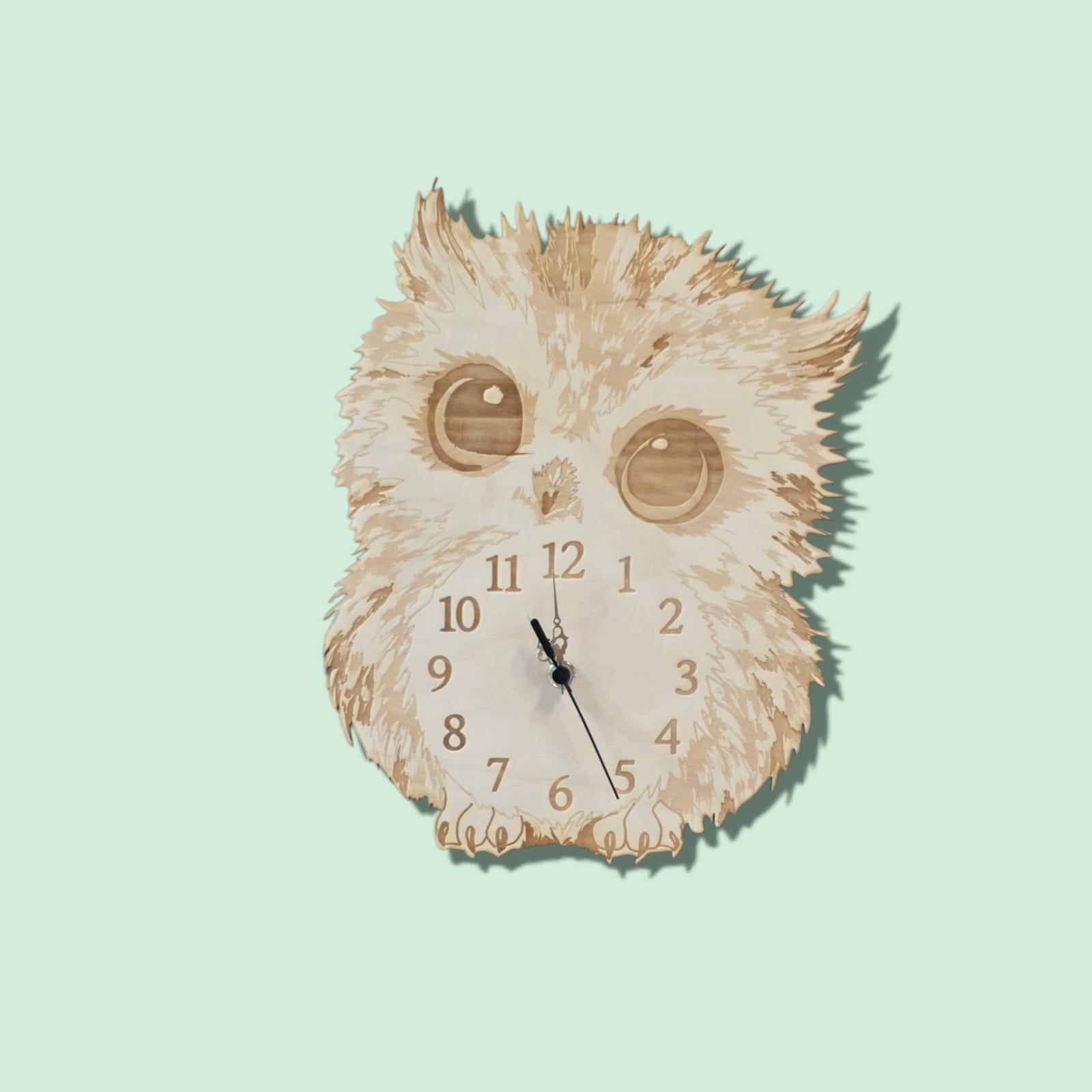 Tässä suloinen pöllökello lastenhuoneen sisustamiseen puunvärisenä. Puun luonnollinen väri rauhoittaa jo värikästä sisustusta ja tuo tarpeellisen kontrastin vaaleampaan tilaan.