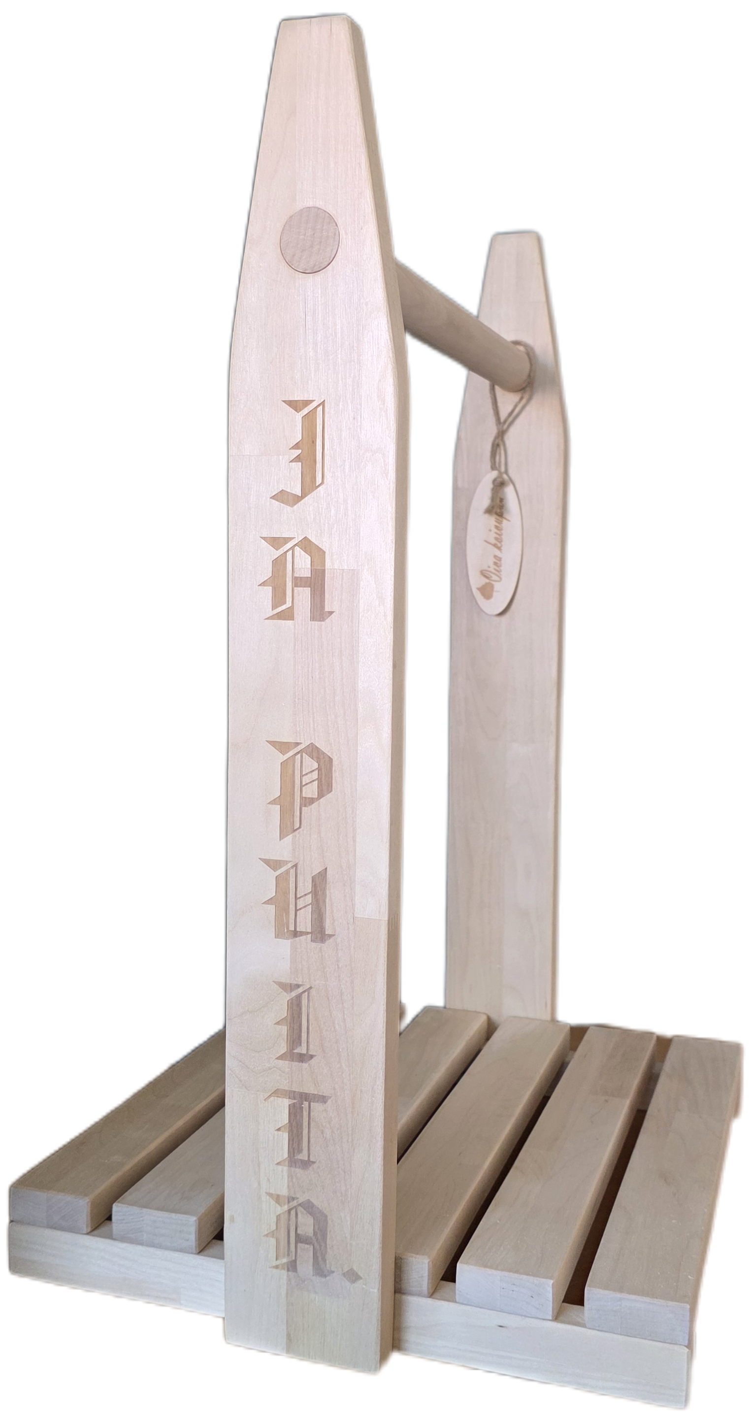 Osta omaksi tai lahjaksi. Puunkantotelineen personointi, ota yhteyttä. Kuvassa malliesimerkki personoidusta puunkantotelineestä. Laserointi hinta +40€ sis. molemmat sivut.