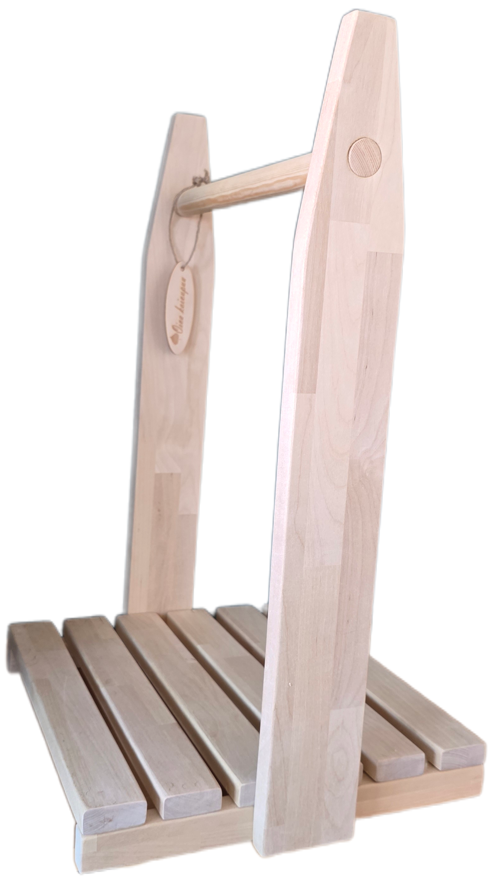 Laadukas puusepän tekemä puunkantoteline. Valmistettu kotimaisesta koivusta, kaunis ja kestävä.