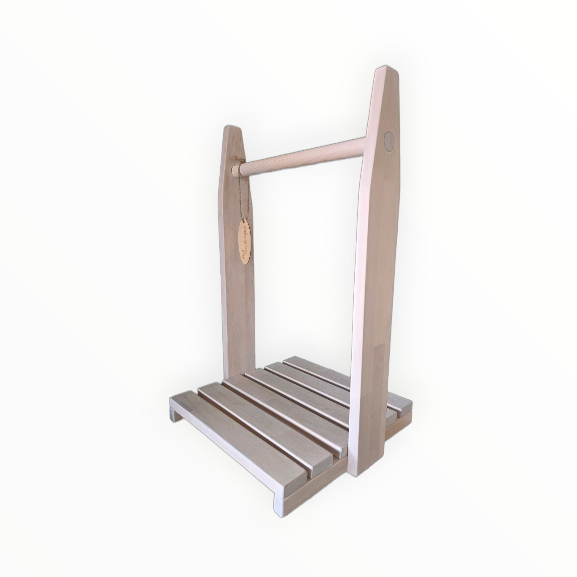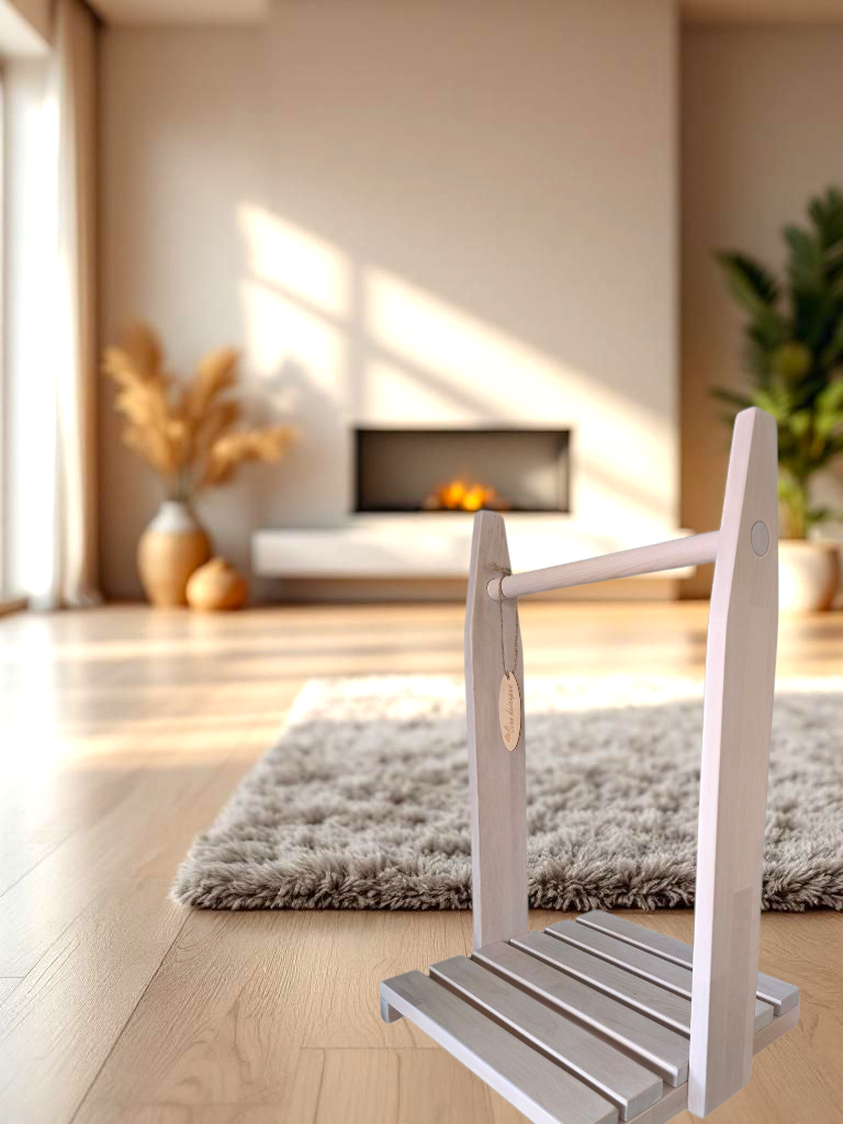 Laadukas kotimainen puunkantoteline koivusta, käsitelty puu- öljyvahalla, väri kuultavan valkoinen. Vaalean sisustuksen ehdoton hankinta ja kaunis annettavaksi lahjana.