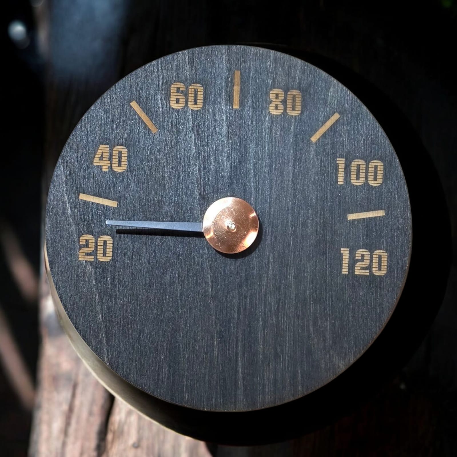 Kotimaisesta koivuvanerista valmistettu saunamittari. Takana tuotteessa kiinnitysreikä ruuvia varten.