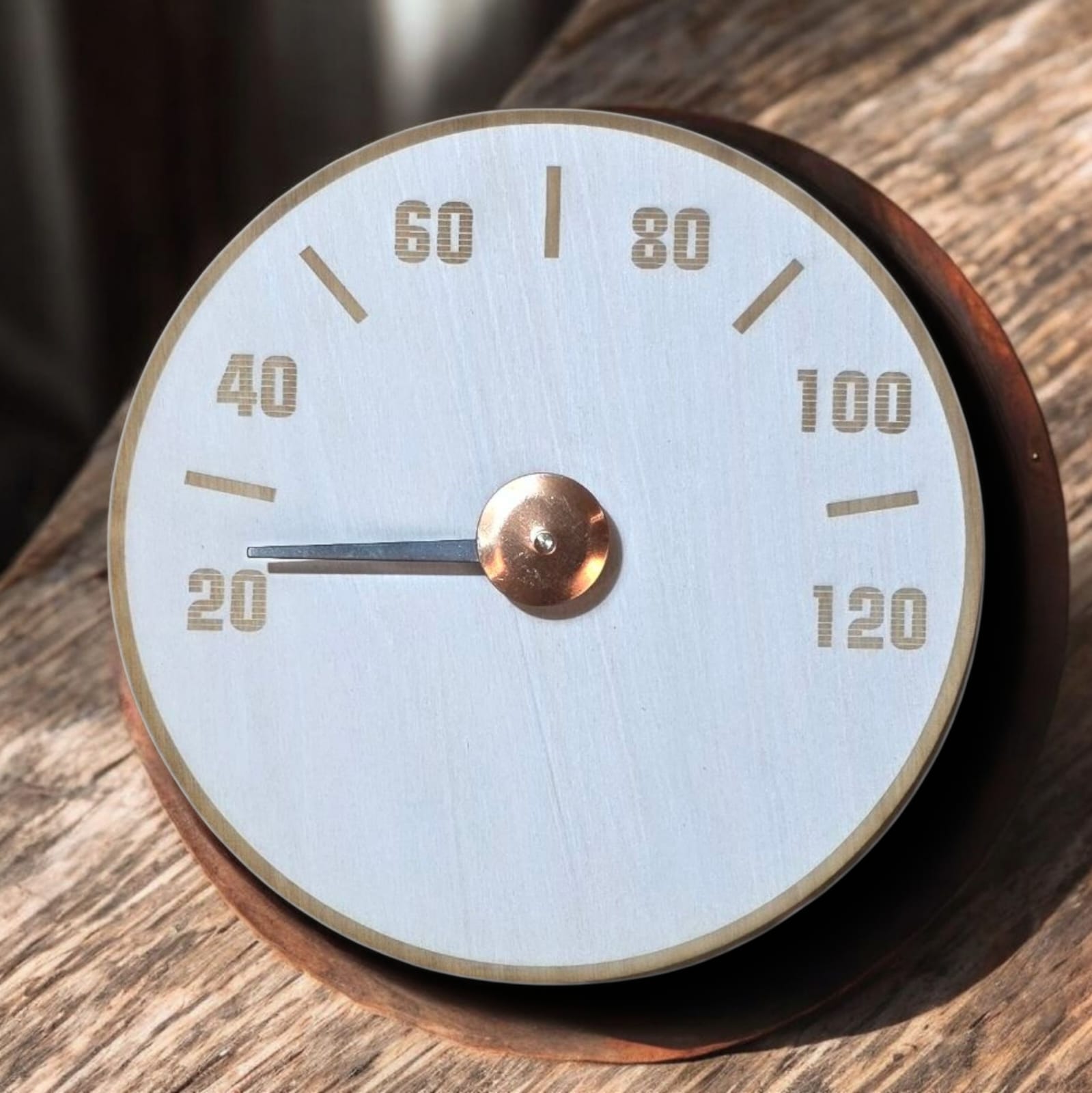 Kotimaisesta koivuvanerista valmistettu saunamittari. Takana tuotteessa kiinnitysreikä ruuvia varten.